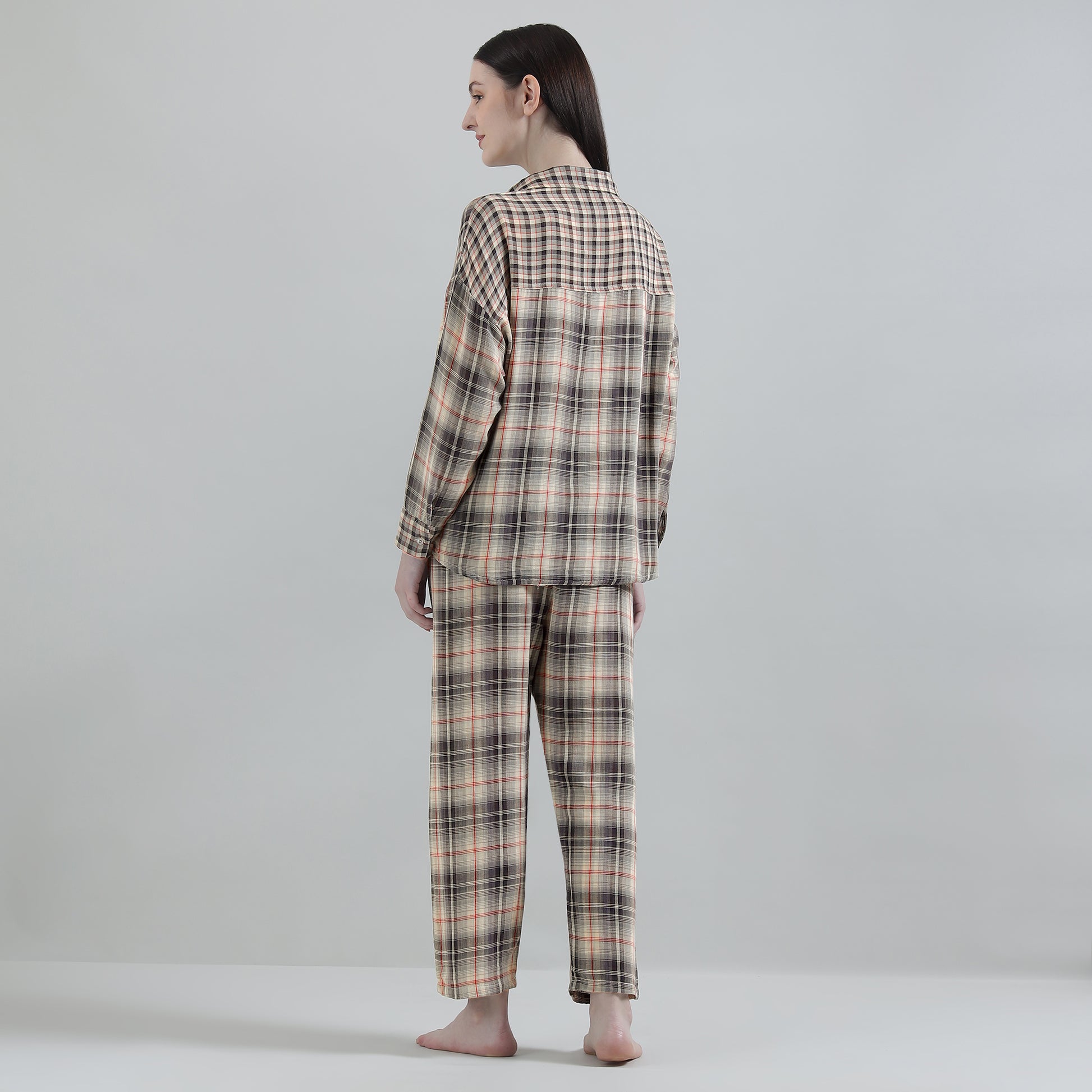 The shirt includes a button-down front, a contrast check pocket, and thoughtfully designed reversible fabric detailing. When the collar is lifted or the sleeves are rolled, the inside pattern subtly reveals itself — adding a stylish, elevated touch to this comfortable set. Paired with straight-fit bottoms with a flexible elastic waist, it’s perfect for lounging, sleeping, work-from-home, travel, and everyday ease.